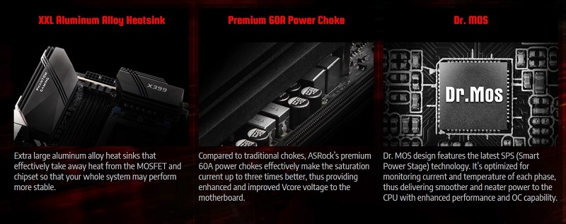 توجه داشته باشید که این مادربرد تنها تا مدل های 16 هسته ای Threadripper پشتیبانی می کند، و سری 24 هسته ای و 32 هسته ای سری Threadripper WX را پشتیبانی نمی شوند. حرارت گیر چیپست و برد PCB این مادربرد دارای رگههای سرخ هستند. حرارت گیر مشکی مدارت تغذیه که توسط یک لوله ناقل حرارت با حرارت گیر بالایی در تماس است، اغلب اجزای پنل پشتی مادربرد را پوشانده است. این مادربرد از طریق یک جفت کانکتور تغذیه 8 پینی و یک 24 پینی تغذیه میشود.