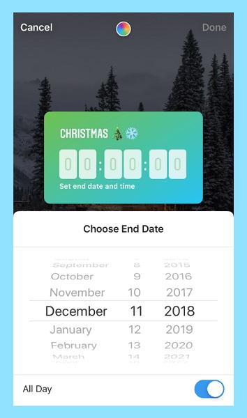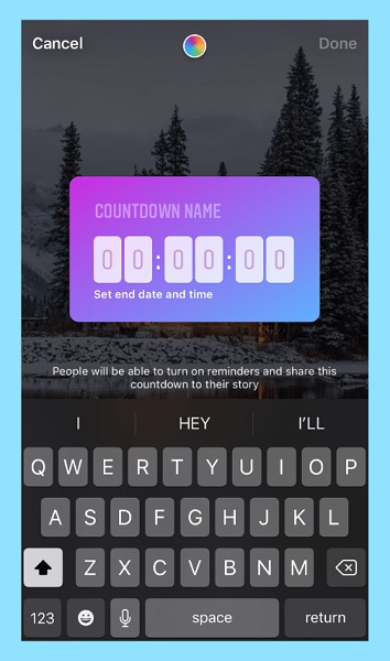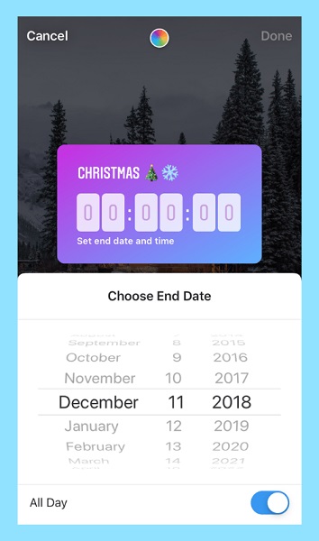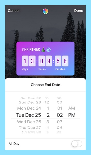 در مرحله بعد با کلیک روی اعداد، زمان پایان شمارش معکوس را مشخص کنید. در آخر روی Done کلیک کنید تا استیکر روی عکس یا ویدیوی شما قرار گیرد.