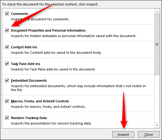 پنجره Document Inspector ظاهر می شود؛ مطمئن شوید که گزینه Document Properties and Personal Information تیک خورده است. سپس روی Inspect کلیک کنید. در صفحه بعدی، گزینه Remove All را انتخاب کنید تا تمامی اطلاعات حذف شود.