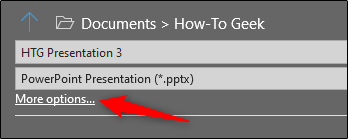 تمامی عکس های موجود در پاورپوینت را می توانید در یک لحظه و با یک حرکت، فشرده کنید. به قسمت File رفته و در منوی سمت چپ صفحه، Save As را انتخاب کنید. سپس زیر قسمتی که نام فایل را مشخص می کنید، گزینه More options را انتخاب کنید.