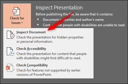 مایکروسافت اطلاعات شخصی مانند نام نویسنده و یا اطلاعات مخفی را به همراه پاورپوینت ذخیره می کند که با جلوگیری از این کار، می توانید کمی فضا برای خود ایجاد کنید. به قسمت file رفته و گزینه Check for Issues را انتخاب کنید، سپس روی Inspect Document کلیک کنید.