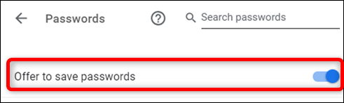 شما همچنین می توانید عبارت chrome://settings/passwords را در امینیباکس تایپ کرده و کلید اینتر را فشار دهید. در صورتی که تیک گزینه Offer to Save Passwords خاموش بود، آن را روشن کنید.
