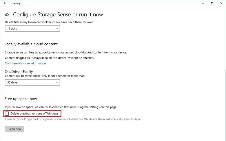 انتهای صفحه، پایین بخش “Free up space now” گزینه‌ Delete previous version of Windows را فعال کنید. در آخر بر روی گزینه Clean now کلیک کنید. پس از طی کردن مراحل بالا، فولدر Windows.old که حاوی اطلاعات نسخه قبلی ویندوز شماست پاک شده و قادر خواهید بود از فضای آزاد شده برای ذخیره اطلاعات مهم‌ خود استفاده کنید.