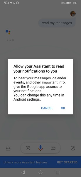 برای شروع ، از دستیار بخواهید “پیامهای من را بخواند” و این فرمان باعث می شود شما اجازه دسترسی به اعلان ها را داشته باشید. پس از اعطای مجوز ، پیام های شما دوباره خوانده می شود و گوگل اسیستنت از شما می خواهد که از طریق صدا پاسخ دهید. برنامه های واتس اپ، تلگرام، گروپ می و فیس بوک منیجر، از جمله برنامه هایی است که با این روش منطبق شده و کار می کنند. پنجره گوگل اسیستنت پیش نمایشی از پیام، نام مخاطب و اپلیکیشنی را که قصد پاسخ دادن به آن را دارید، نمایش می دهد.