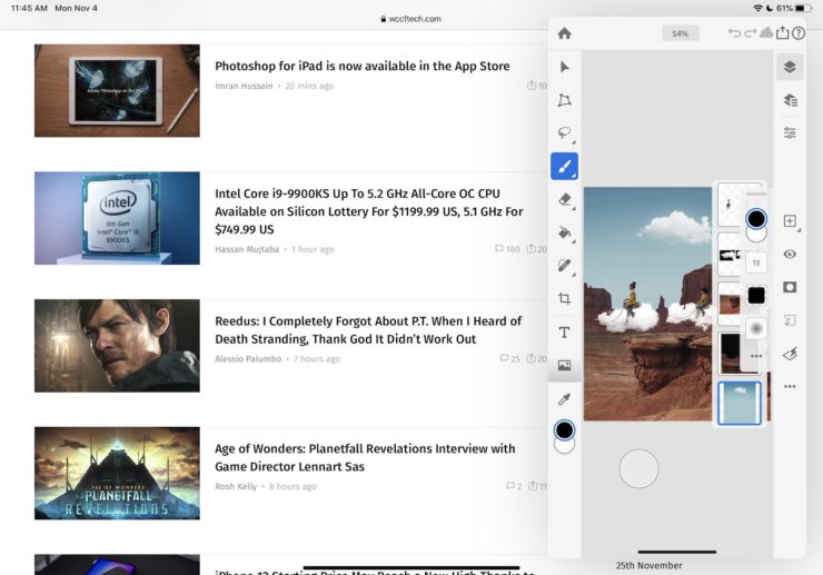 سرانجام، شرکت ادوبی اولین نسخه از اپلیکیشن ویرایش عکس فتوشاپ را برای تبلت اپل آیپد منتشر کرد. این بروزرسانی به صورت آزمایشی 30 روزه در دسترس بوده و کاربران می توانند طی این مدت از تمام امکانات این نرم افزار نظیر ویرایش فایل های PSD، لایه ها، ابزارهای تولید متن، ابزارهای انتخاب پیشرفته، ابزار روتوش و پشتیبانی از همگام سازی ابری برخوردار باشند.