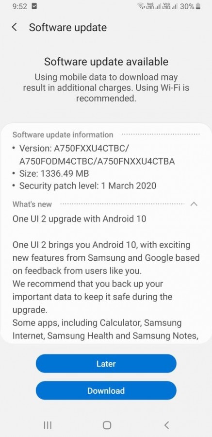بروزرسانی اندروید 10 برای گلکسی A7 2018 دارای شماره نسخه A750FXXU4CTBC و حجم 1.3 گیگابایت بوده و شامل رابط کاربری One UI 2.0، حالت تاریک، و پچ امنیتی اول ماه مارس 2020 می شود. از سوی دیگر این آپدیت برای گلکسی A6 2018 با شماره نرم افزاری A600FNXXU5CTB9 ارائه شده و شامل رابط کاربری One UI 2.0 و پچ امنیتی ماه مارس 2020 است.