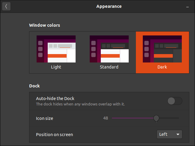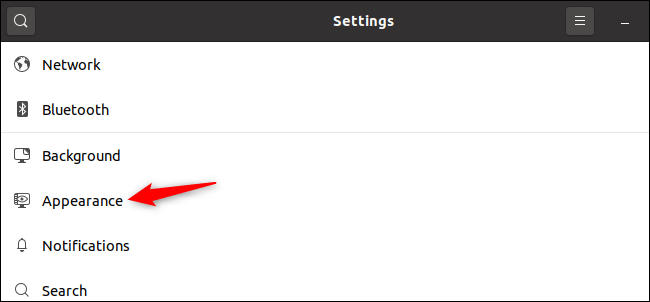روی Appearance در برنامه تنظیمات کلیک کنید. به طور پیش فرض، اوبونتو از تم رنگ پنجره استاندارد با نوارهای ابزار تاریک و صفحه های محتوای سبک استفاده می کند. برای فعال کردن حالت تاریک اوبونتو، بر روی Dark کلیک کنید. برای استفاده از یک حالت لایت بدون نوار ابزار تاریک، به جای آن بر روی “Light” کلیک کنید.