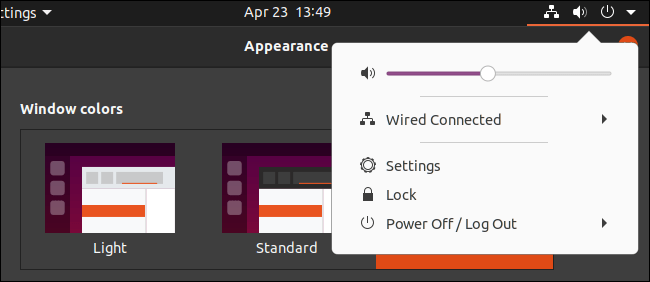 پس از کلیک بر روی هرکدام، تغییرات شما بلافاصله اعمال می شود. اکنون می توانید پنجره را ببندید. توجه داشته باشید که این مورد، رابط پنل اوبونتو را به حالت تاریک تغییر نخواهد داد. به عنوان مثال، هنگامی که روی دکمه منو در گوشه سمت راست بالای صفحه نمایش خود کلیک می کنید، می بینید که حتی در صورت فعال بودن حالت تاریک، دارای یک پس زمینه سبک است.