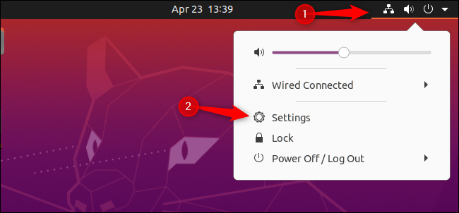 برای اینکار ابتدا بر روی دکمه منوی سیستم پنل بالا در گوشه سمت راست میزکار گنوم اوبونتو کلیک کنید و Settings را انتخاب کنید. همچنین می توانید بر روی دکمه Show Applications در گوشه سمت چپ صفحه نمایش خود کلیک کنید، برنامه Settings را جستجو کنید و از آنجا راه اندازی کنید.