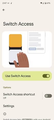 - در گوشی خود، به Settings > Accessibility > Switch Access بروید