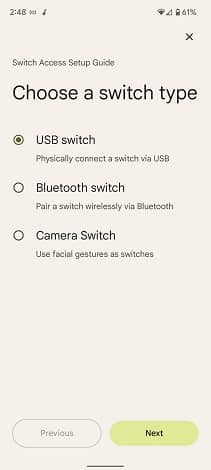 - سپس از شما خواسته می شود که یک نوع سوئیچ را انتخاب کنید. میتوانید از یک سوئیچ فیزیکی از طریق USB یا بلوتوث استفاده کنید، اما ما به جای آن از سوئیچ دوربین استفاده میکنیم. برای گرفتن عکس و ضبط ویدیو از شما اجازه درخواست میشود و ممکن است نیاز به دانلود حدود 10 مگابایت داده داشته باشید.
