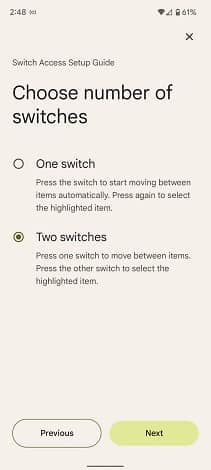 - در مرحله بعد، برنامه از شما می خواهد که بین استفاده از یک یا دو سوئیچ یکی را انتخاب کنید. این کمی گیج کننده است: معنای واقعی آن این است که شما می توانید فقط از یک حرکت برای شروع اسکن خودکار آنچه روی صفحه است استفاده کنید و سپس همان حرکت را برای انتخاب آن انجام دهید (یک سوئیچ)، یا می توانید از دو یا چند حرکت استفاده کنید. در هر صورت، پس از انتخاب خود، روی «Next» ضربه بزنید.