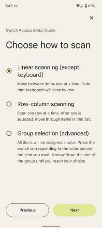 - اکنون باید یکی از سه روشی را انتخاب کنید که بتوانید با استفاده از حرکات صورت در آیتمهای عملی خود حرکت کنید. Linear Scanning به این معنی است که هر ژست آیتم به مورد جلو می رود؛ Row-Column Scanning به شما امکان می دهد یک ردیف از موارد را انتخاب کنید و سپس به پایین بیایید؛ انتخاب گروه به همه موارد رنگ متفاوتی اختصاص میدهد – شما از حرکات صورت برای انتخاب رنگ مورد نظر خود استفاده میکنید و از آنجا به پایینتر میپردازید.