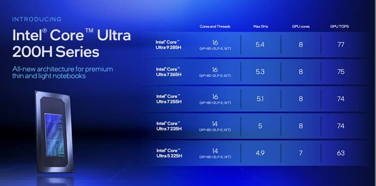 اگرچه این تراشه‌ها شگفتی خاصی به همراه ندارند، اما برای کسانی که به دنبال گزینه‌ای با قدرت بیشتر از تراشه‌های Core Ultra 200V AI هستند، مدل‌های 200H و 200HX انتخاب مناسبی به شمار می‌روند. خانواده Core Ultra 200H با پردازنده Core Ultra 9 285H که شامل 16 هسته (شش هسته کارایی، هشت هسته کارآمد و دو هسته کم مصرف) و حداکثر سرعت 5.4 گیگاهرتز است، برتری خاصی دارد.