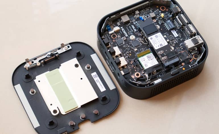 NUC 14 Pro AI دارای یک اسلات SSD است که از درایوهای PCIe Gen4x4 در اندازه استاندارد M.2 2280 پشتیبانی میکند. واحد بررسی با یک SSD NVMe از برند WD به ظرفیت 1 ترابایت ارائه شده که با مشخصات مورد نیاز همخوانی دارد. این SSD فاقد هیتسینک است، اما شرکت ایسوس از یک پد حرارتی در قسمت زیرین پوشش فلزی استفاده کرده که باعث میشود این پوشش بهعنوان هیتسینک برای درایو عمل کند.