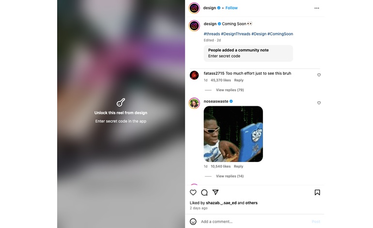 نحوه عملکرد این قابلیت در یک مثال آزمایشی، حساب کاربری طراحی اینستاگرام یک ریلز قفلشده منتشر کرد که برای باز کردن آن، کاربران باید کدی را وارد میکردند که مربوط به اولین هشتگ در کپشن بود. پس از وارد کردن کد صحیح، کاربران به ویدیویی دسترسی پیدا میکردند که خبر از راهاندازی یک پروفایل جدید در تردز میداد.