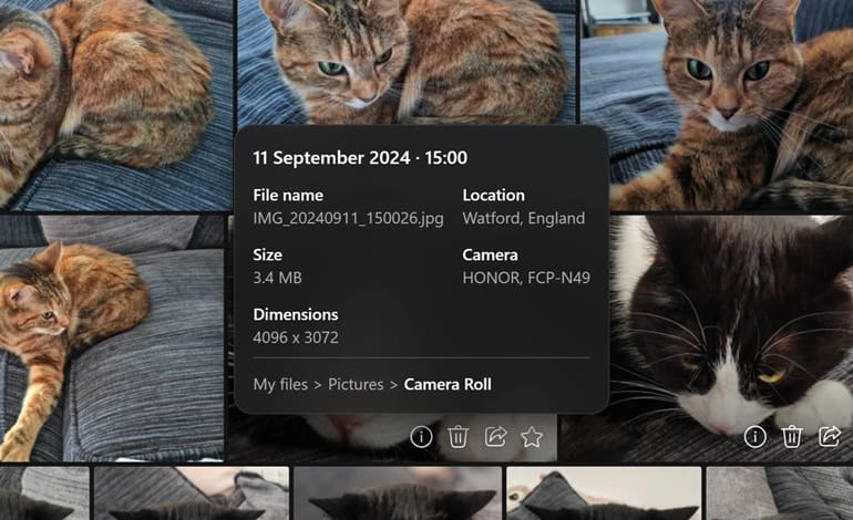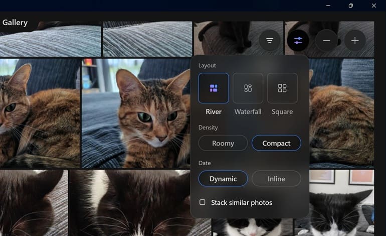 نمای گالری دارای یک نوار ابزار شناور در پایین صفحه است که با طراحی گوشههای گرد و افکتهای محو، کاملاً با سبک ویندوز 11 هماهنگ است. کاربران میتوانند تصاویر را انتخاب کرده و اقداماتی مانند اشتراکگذاری، افزودن به آلبومها، علامتگذاری بهعنوان علاقهمندی و موارد دیگر انجام دهند. علاوه بر این، منوی گالری امکاناتی برای تنظیم نحوه نمایش، از جمله انتخاب بین طرحهای River، Waterfall یا Square، و همچنین تعیین تراکم نمایش به صورت Roomy یا Compact ارائه میدهد.