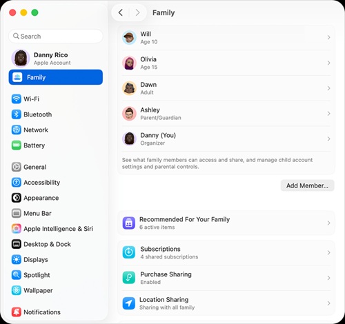 در مک، روند کار کمی متفاوت است اما نتیجه نهایی یکسان خواهد بود. System Settings را باز کرده، نام خود را انتخاب کنید و سپس گزینه Family را برگزینید. در این بخش میتوانید عضو جدیدی اضافه کنید، دعوتنامه ارسال نمایید یا حساب کودک را با کنترلهای والدین تنظیم کنید. پس از پذیرش دعوت، فرد بهطور خودکار در فهرست اعضای گروه ظاهر میشود.