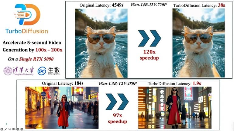 در آزمایشها، روی یک کامپیوتر مجهز به کارت گرافیک Nvidia RTX 5090، زمان تولید یک کلیپ 5 ثانیهای با کیفیت استاندارد از بیش از سه دقیقه به تنها 1.9 ثانیه کاهش یافت. برای کلیپهای HD همین طول، زمان از حدود 80 دقیقه به 24 ثانیه رسید. ابزارهای فعلی مانند Vidu از ShengShu و Sora از OpenAI همچنان چند دقیقه برای تولید کلیپهای کوتاه زمان نیاز دارند. اما TurboDiffusion میتواند این گلوگاه را برطرف کرده و مسیرهای کاری سریعتر در حوزه انیمیشن، فیلمسازی و تولید محتوا فراهم کند.